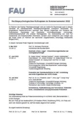 Im Rahmen des Faches „Rechtspsychologie“ wird am Institut für Psychologie auch in diesem Semester ein interdisziplinäres Rechtspsychologisches Kolloquium veranstaltet. Die eingeladenen Referenten berichten über aktuelle Ergebnisse und Probleme der Forensischen Psychologie und Psychiatrie, Kriminalpsychologie, Kriminologie, Strafrechtswissenschaft und anderer Rechtsgebiete. Die Veranstaltung soll nicht nur Studierende und Wissenschaftler informieren, sondern auch Kolleginnen und Kollegen aus der Praxis sowie (im Rahmen der räumlichen Gegebenheiten) einschlägig interessierte Bürger(innen).