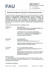 Im Rahmen des Faches „Rechtspsychologie“ wird am Institut für Psychologie auch in diesem Semester ein interdisziplinäres Rechtspsychologisches Kolloquium veranstaltet. Die eingeladenen Referenten berichten über aktuelle Ergebnisse und Probleme der Forensischen Psychologie und Psychiatrie, Kriminalpsychologie, Kriminologie, Strafrechtswissenschaft und anderer Rechtsgebiete. Die Veranstaltung soll nicht nur Studierende und Wissenschaftler informieren, sondern auch Kolleginnen und Kollegen aus der Praxis sowie (im Rahmen der räumlichen Gegebenheiten) einschlägig interessierte Bürger(innen).